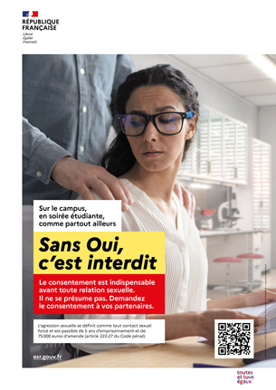 Afin de sensibiliser la communauté universitaire dans la lutte contre les VSS, l'Université relaie sur ses 澳门银河的网站多少 la campagne nationale de communication sur le consentement lancée par le ministère de l'enseignement supérieur et de la recherche et con?ue en partenariat avec l’association Sexe & Consentement.